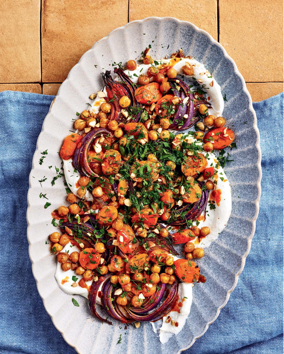 - Serve the veggies on a bed of whipped feta, topped with toasted nuts and an extra dollop of harissa if you like it spicy.